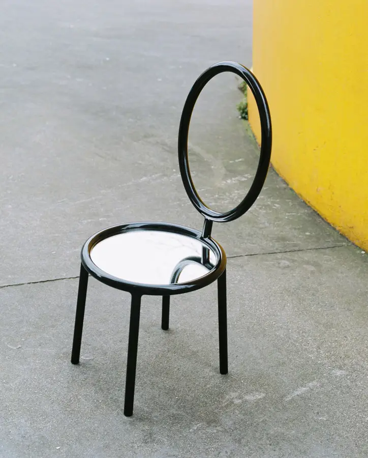 "L'artiste français Pierre Charpin a introduit cette version minimale de la chaise, qui comporte un cadre en acier noir et une assise en miroir. Le geste permet à la personne assise de "se regarder avant d'être regardée", selon Charpin. "