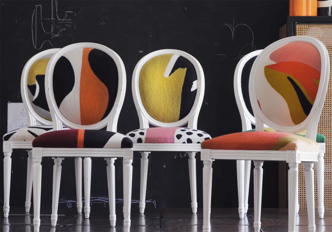 " La designer India Mahdavi a créé cinq variations de couleurs sur la chaise Medallion, dont les coussins brodés exploitent les techniques artisanales du Cachemire. La collection forme "une tribu unie en dépit de son individualité".