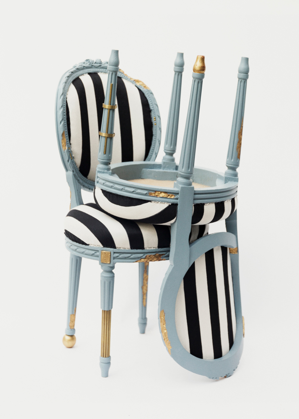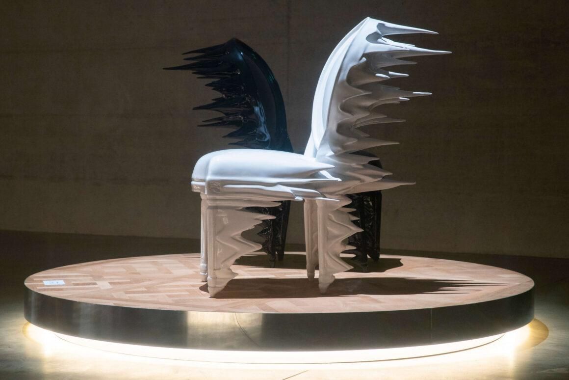 "La firme milanaise Dimorestudio a abordé la conception de sa chaise en jouant sur l'histoire, ce qui est sa signature. La chaise a été conçue pour donner l'impression d'être démontée puis rapiécée avec du bronze et du laiton ; les fissures et les craquelures ont été remplies de feuilles d'or."