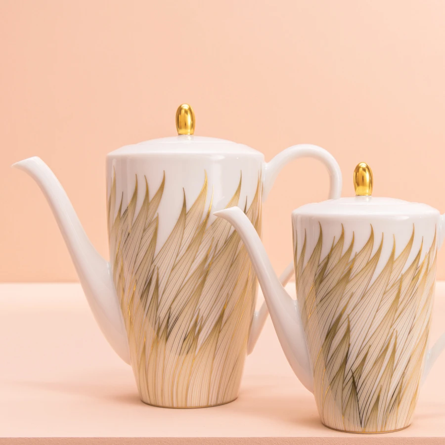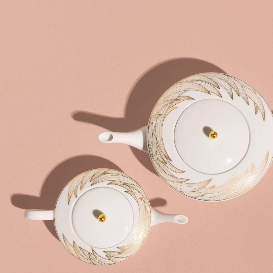 Des teintes chaudes, presque incandescentes, qui évoquent la fin de journée. Des motifs puissants, inspirés de l’oiseau mythique, travaillés avec précision sur la porcelaine.