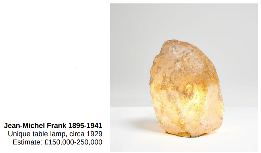 La lampe de table unique conçue par Jean-Michel Frank est un autre point fort de la vente. Sculptée dans un seul morceau de cristal de roche, cette œuvre rare a été acquise par la famille d’Alice Cerf et est restée dans la même famille depuis. La présente œuvre est un brillant exemple de l’habileté de Frank à prendre un matériau rugueux, grossier et brut et à le transformer en un objet luxueux et magnifique. Apparaissant rarement sur le marché ou proposée aux enchères, la dernière lampe de cette série a été vendue chez Phillips en décembre 2018.