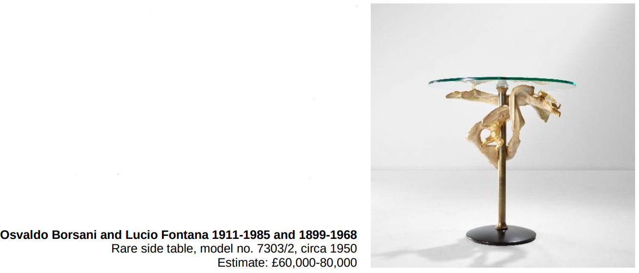 Une table d’appoint rare, conçue par Osvaldo Borsani et Lucio Fontana, est la pièce maîtresse italienne. L’architecte et l’artiste ont travaillé en étroite collaboration sur plusieurs projets, leur synergie a donné lieu à des intégrations de meubles et d’œuvres d’art mondialement acclamées et recherchées. Ce concept est clairement incarné dans la présente table d’appoint où l’élément vertical en laiton soutenant le plateau en verre est enveloppé dans une cascade ondulante de draperies en bois peint. Cette collaboration artistique a donné naissance à une série de meubles, dont des exemples ont été proposés lors de précédentes ventes aux enchères chez Phillips, notamment une console murale qui a atteint un record mondial lorsqu’elle a été vendue aux enchères pour plus d’un million de livres sterling en 2020.