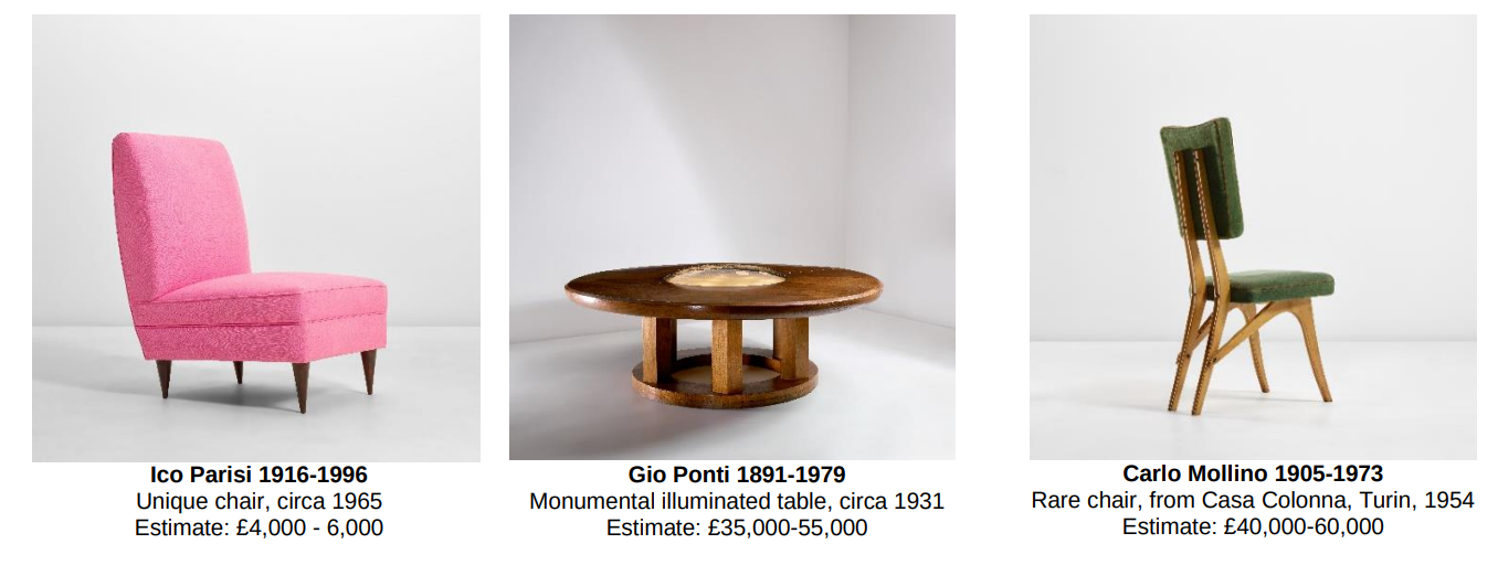 Voici trois autres pièces maîtresses du design italien qui figureront dans la vente, notamment des œuvres d’Ico Parisi, Gio Ponti et Carlo Mollino, entre autres