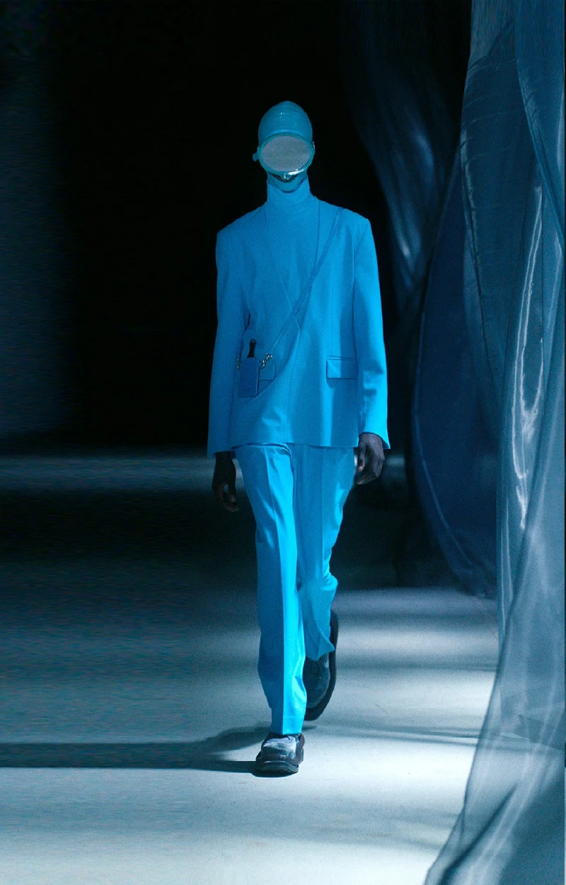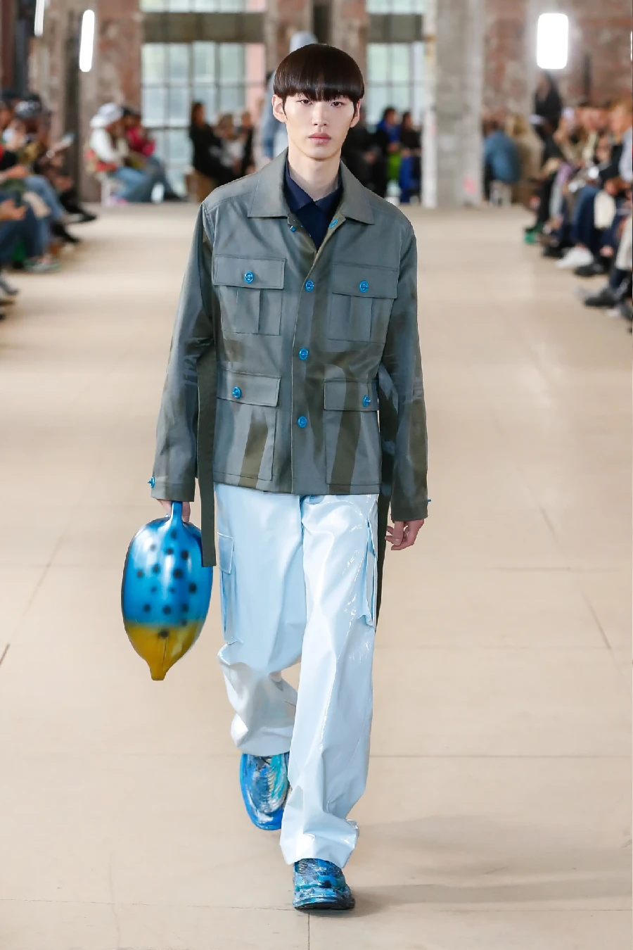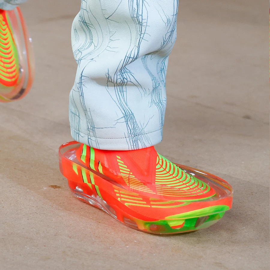 À travers cette collection les créateurs incluent des touches d’humour assez audacieuses, décalées et étonnantes en lien avec le thème aquatique. Pour l’occasion, ils ont réalisé des gants et baskets bordées de plastique transparent imitant l’esthétique d’une flaque d’eau.