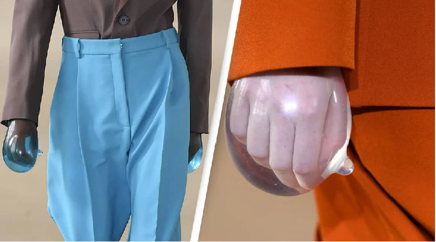 Ces gants, plus qu’atypiques, sont confectionnés avec de ballons transparents remplis d’eau colorée bleue. Le tout représentant des aquariums miniatures flottant au rythme de la démarche des mannequins.