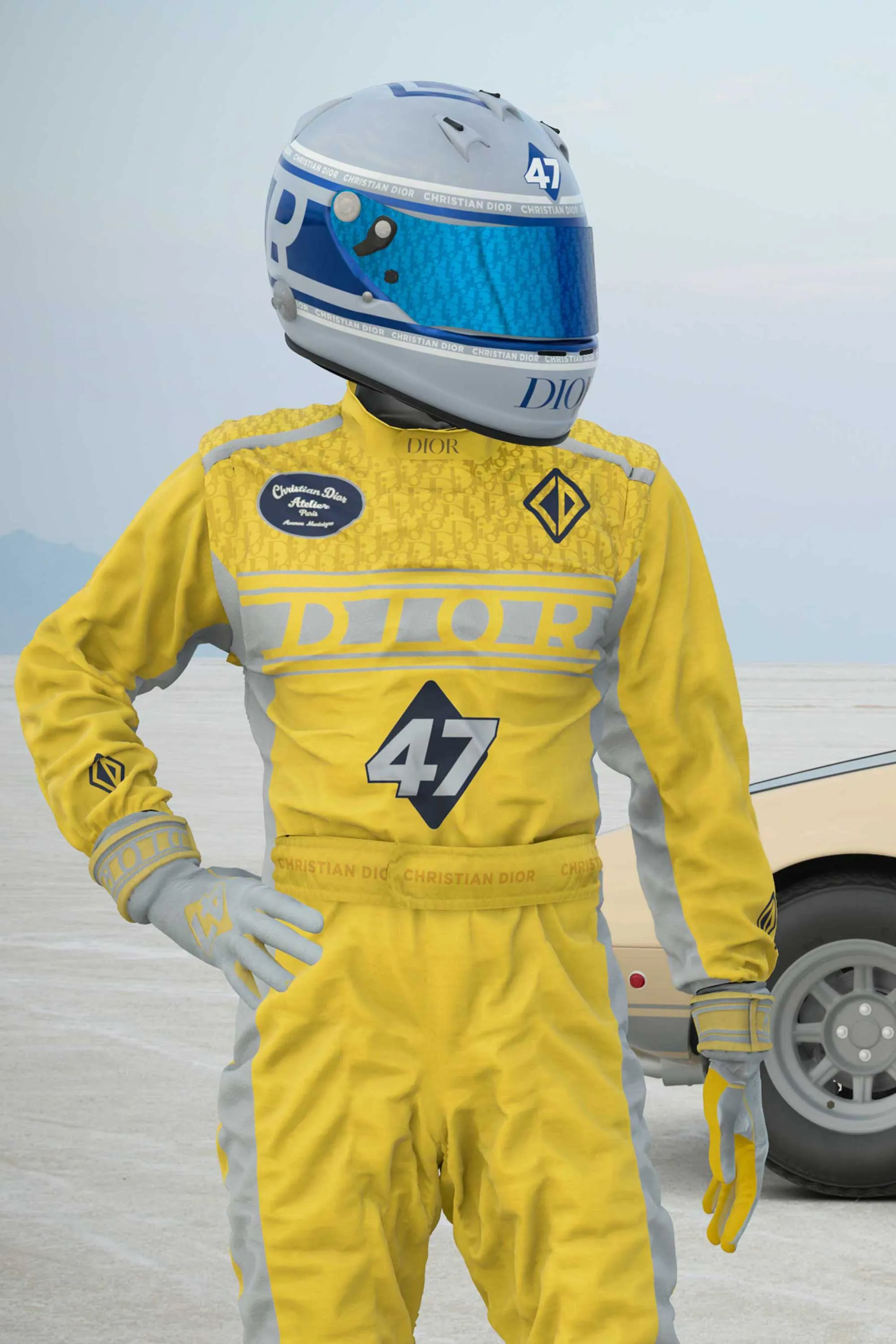La collection capsule virtuelle inaugurale de Dior, qui sera dévoilée le 25 août dans Gran Turismo® 7, comprend une combinaison jaune et grise, des gants assortis, des chaussures Diorizon réinterprétées et un casque bleu et gris. Les modèles intègrent le motif Dior Oblique, signature de la marque, ainsi que les initiales CD Diamond et un patch "Christian Dior Atelier Avenue Montaigne".