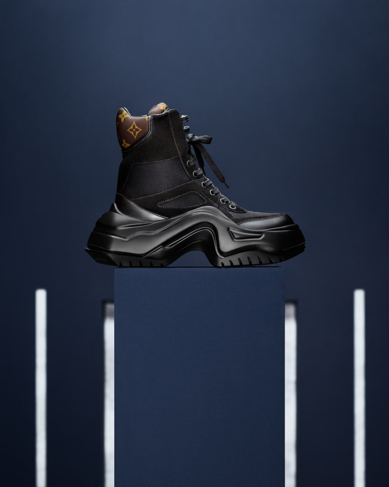 Révélant une allure gothique, la version LV Mansion se distingue par sa silhouette sculpturale habillée de noir, fusion audacieuse d’éléments de la sneaker, de la desert boot et du mocassin. Réalisé dans des cuirs raffinés ou sublimé de dentelle guipure, ce soulier hybride signe une élégance citadine et sophistiquée.