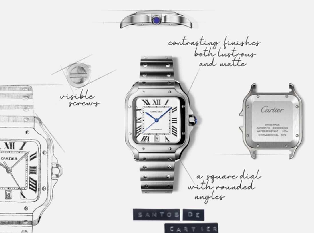 Créée en 1904, la montre Santos repose sur le concept de forme, le goût du minimalisme, la précision des proportions et le souci du détail.
