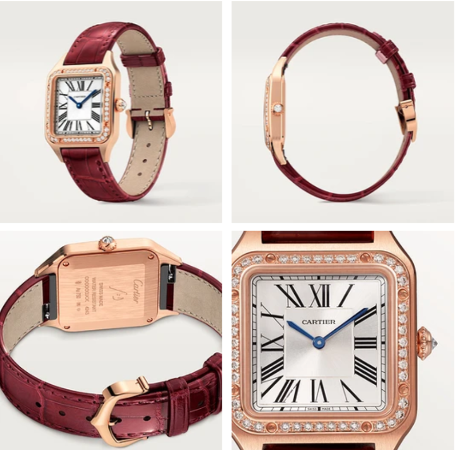 Et voici maintenant la montre Santos-Dumont (20 800€), petit modèle, mouvement à quartz haute-autonomie (~6 ans) faite pour briller ! Celle-ci possède une boîte en or rose 750/1000, une lunette sertie de 44 diamants taille brillant et une couronne perlée sertie d’un diamant taille brillant, pour un total de 0.53 carat, un cadran argenté satiné soleil, des chiffres romains, des aiguilles en forme de glaive en acier bleui et une glace saphir. N’oublions pas son bracelet en alligator bordeaux brillant et sa boucle ardillon en or rose 750/1000.