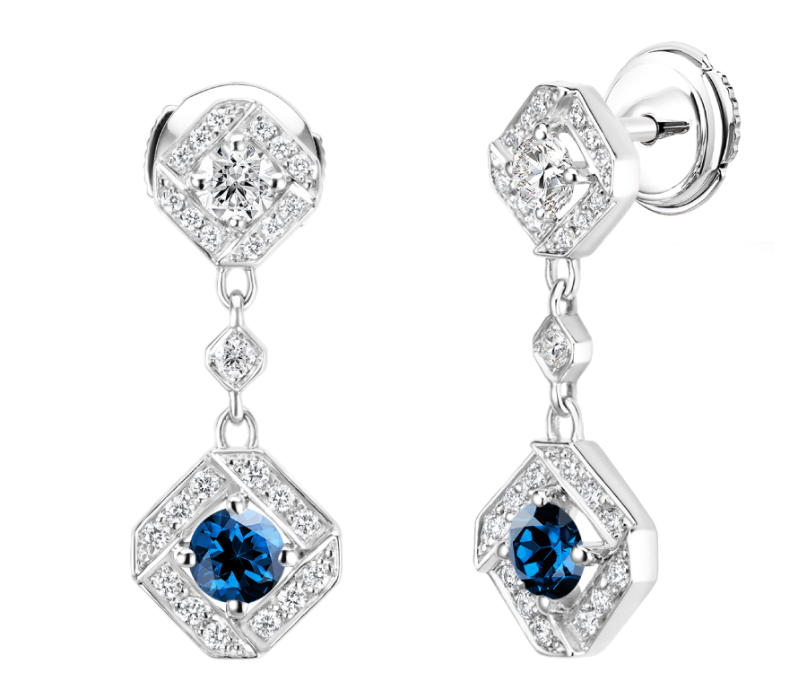 Les boucles d’oreilles Plissage en Saphir et Or blanc 750 ‰ reprennent le motif octogonal des bagues éponymes et jouent sur les dimensions. La succession de formes géométriques, serties de diamants ronds de diverses tailles, apporte de la modernité à un design intemporel. À chaque mouvement, les diamants s’animent et brillent de mille feux. Ces boucles d’oreilles ont été conçues pour être portées avec confort et sécurité grâce à leurs fermoirs de type « Alpa ».