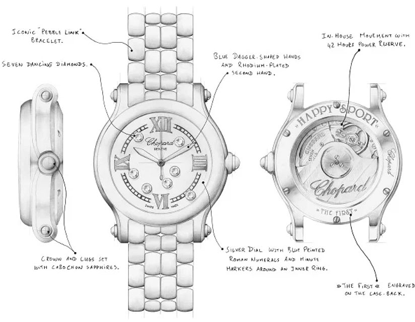 Fidèle à l’esprit des Happy Diamonds qui s’invitent sur son cadran en dansant librement telles des étoiles de ballet entre deux glaces saphir, la montre en diamant Happy Sport est rapidement devenue une icône, tant pour la Maison que dans la catégorie des montres de luxe pour femme.