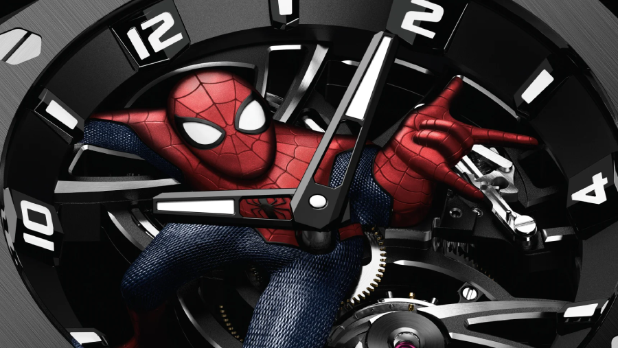 Présenté dans une boîte de 42 mm en titane contrastée par une lunette et une couronne en céramique noire, le mouvement squeletté de la Royal Oak Concept « Spider-Man » Tourbillon apparaît comme le héros de ce garde-temps. Réalisé en trois dimensions et s’étendant sur toute l’épaisseur de la montre, le héros à lui seul nécessite pas moins de 50 heures de travail, repoussant encore les limites du savoir-faire des artisans du Brassus.