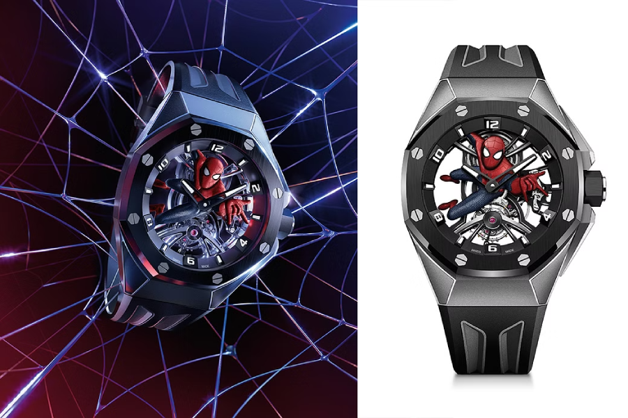 Équipée d’un bracelet en caoutchouc noir et gris terminé par une boucle AP en titane, la Royal Oak Concept Tourbillon « Spider-Man » s’accompagne d’un second