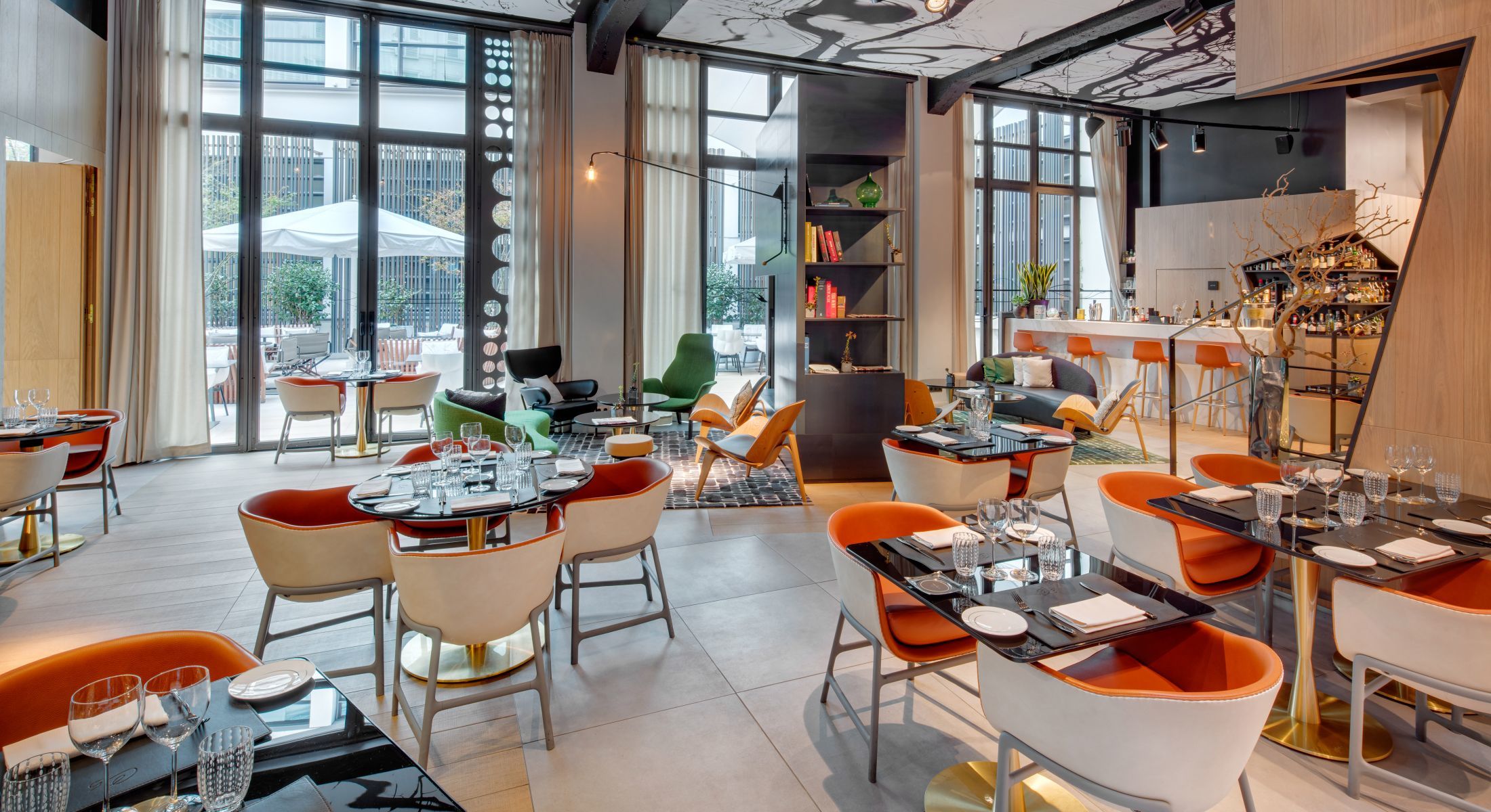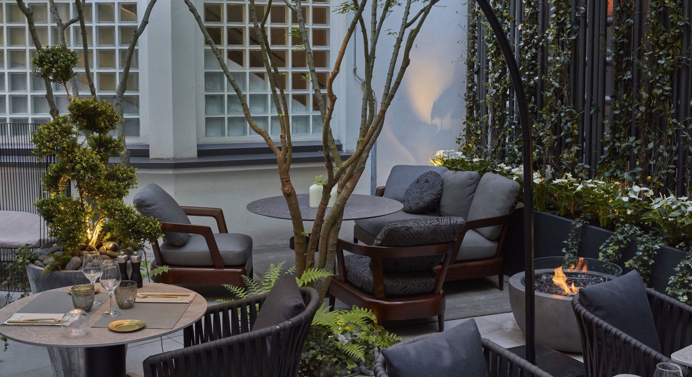Au cœur de l’hôtel, se cache une agréable terrasse ombragée qui propose une parenthèse hors du temps où l’on se prélasse à l’abri des regards. Entre érables japonais, fougères rafraichissantes et mobilier aux coloris naturels et chaleureux, le patio invite à la détente loin du tumulte de la capitale et devient le lieu idéal pour une pause savoureuse.