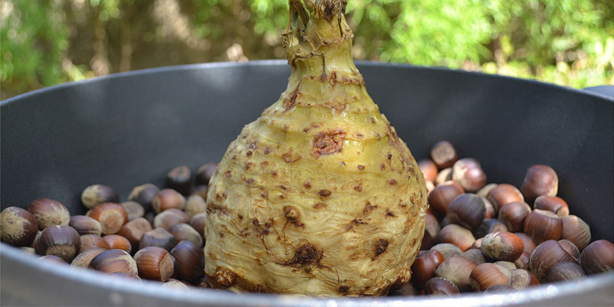 Sa cuisine vivante vit au rythme de la nature. A l’automne, le céleri boule se cuit sur un lit de noisettes tandis que les carottes mijotent dans la terre pour ne pas être dépaysées ! Le lapin maturé au foin afin acquière une chair tendre et plus goûteuse et les cueillettes sauvages ponctuent l’année de belles surprises.