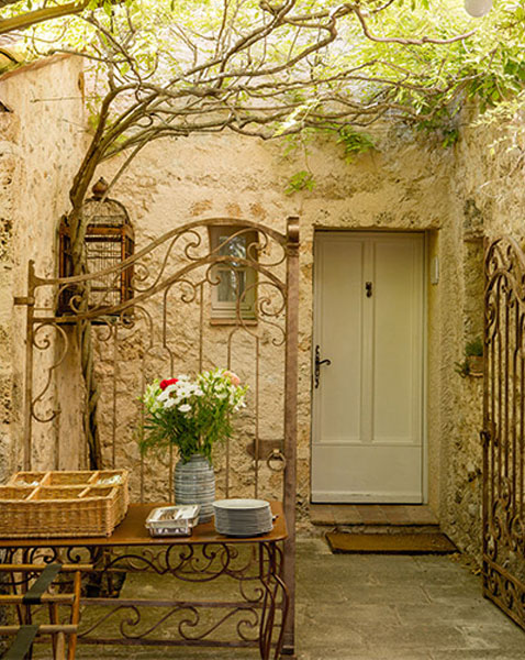 Côté décoration, rien de prémédité, mais la simple intention de redonner vie à un beau patrimoine. Les vieilles pierres, simples témoins d’un riche passé s’agrémentent de murs en chaux et de quelques beaux objets habilement déposés ici ou là comme les tapis de la Manufacture de Cogolin ou les appliques créées par Jean-Claude Navarro, Maître verrier à Biot.