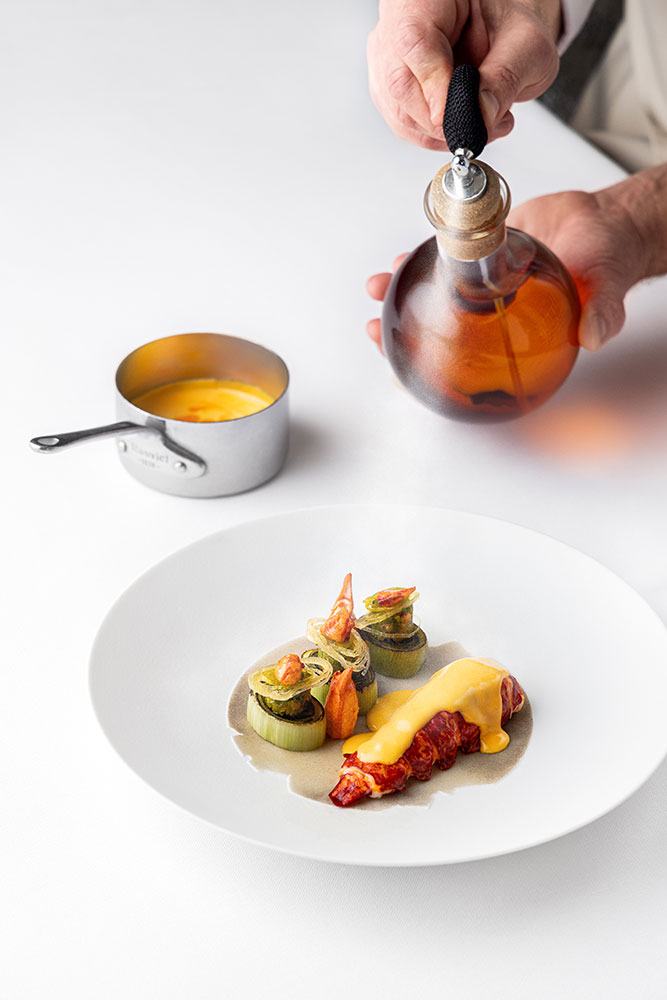 Homard ivre à l'Armagnac, poireaux brulés et sabayon de homard © Victor Bello